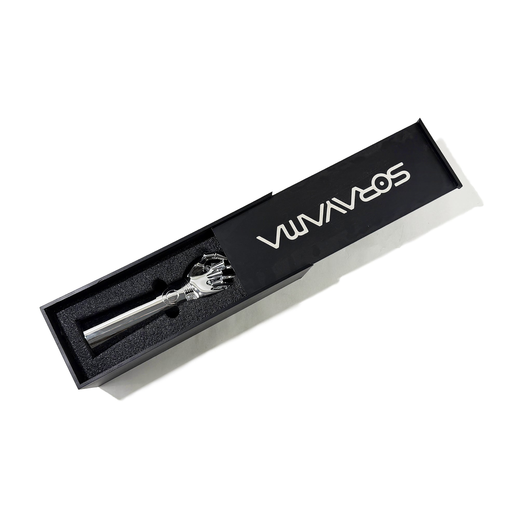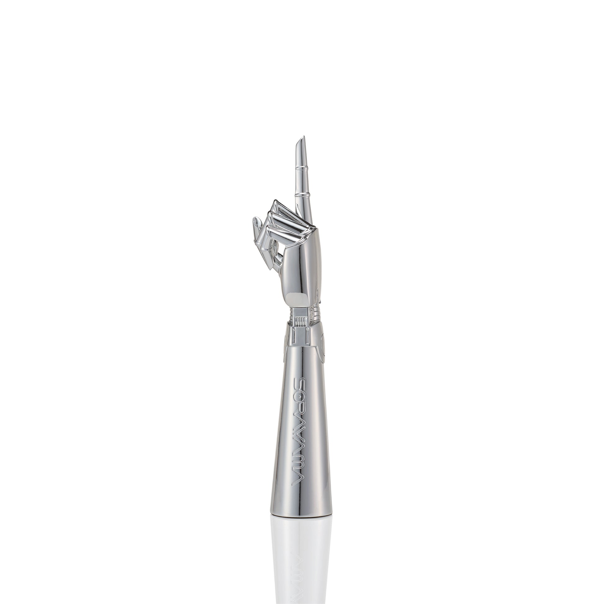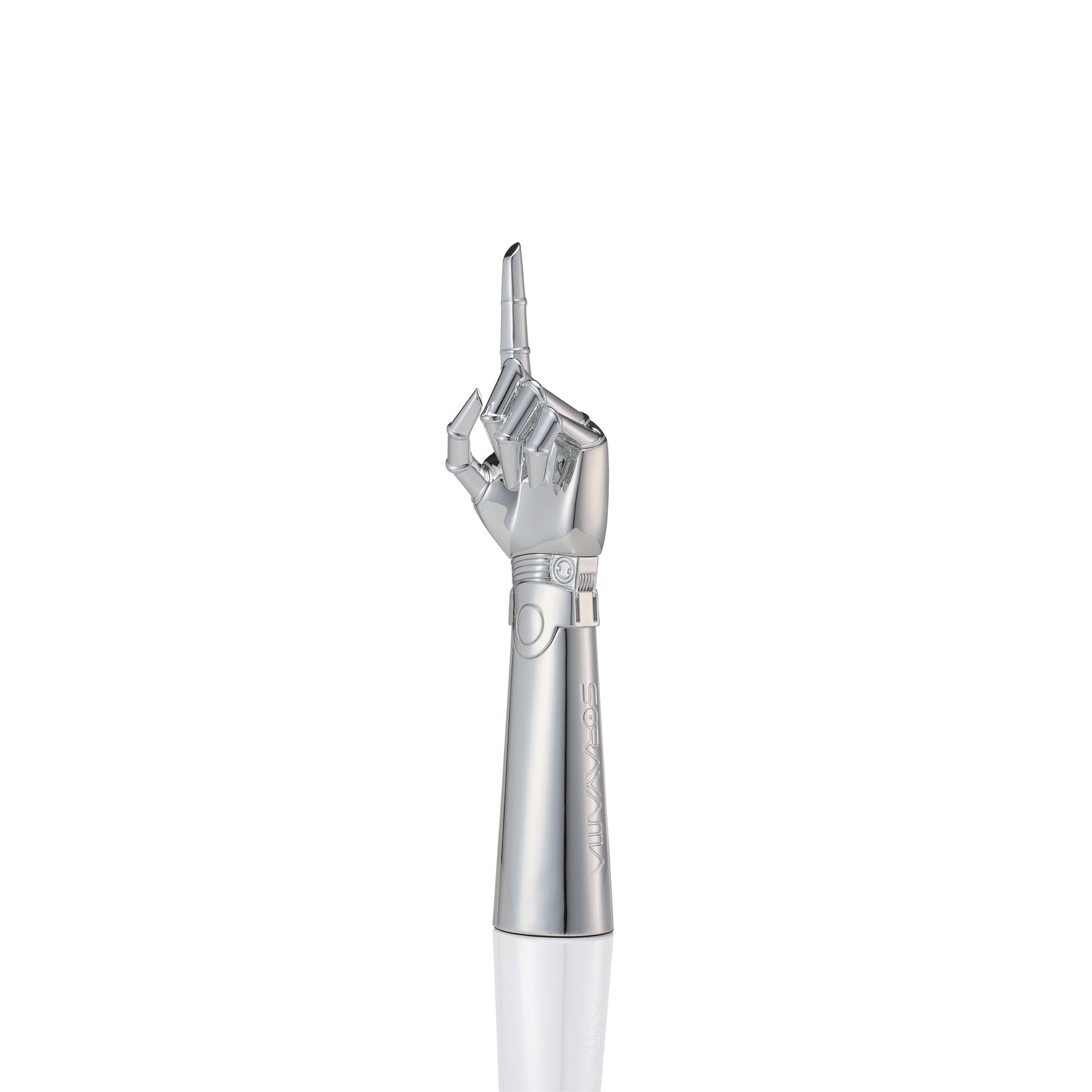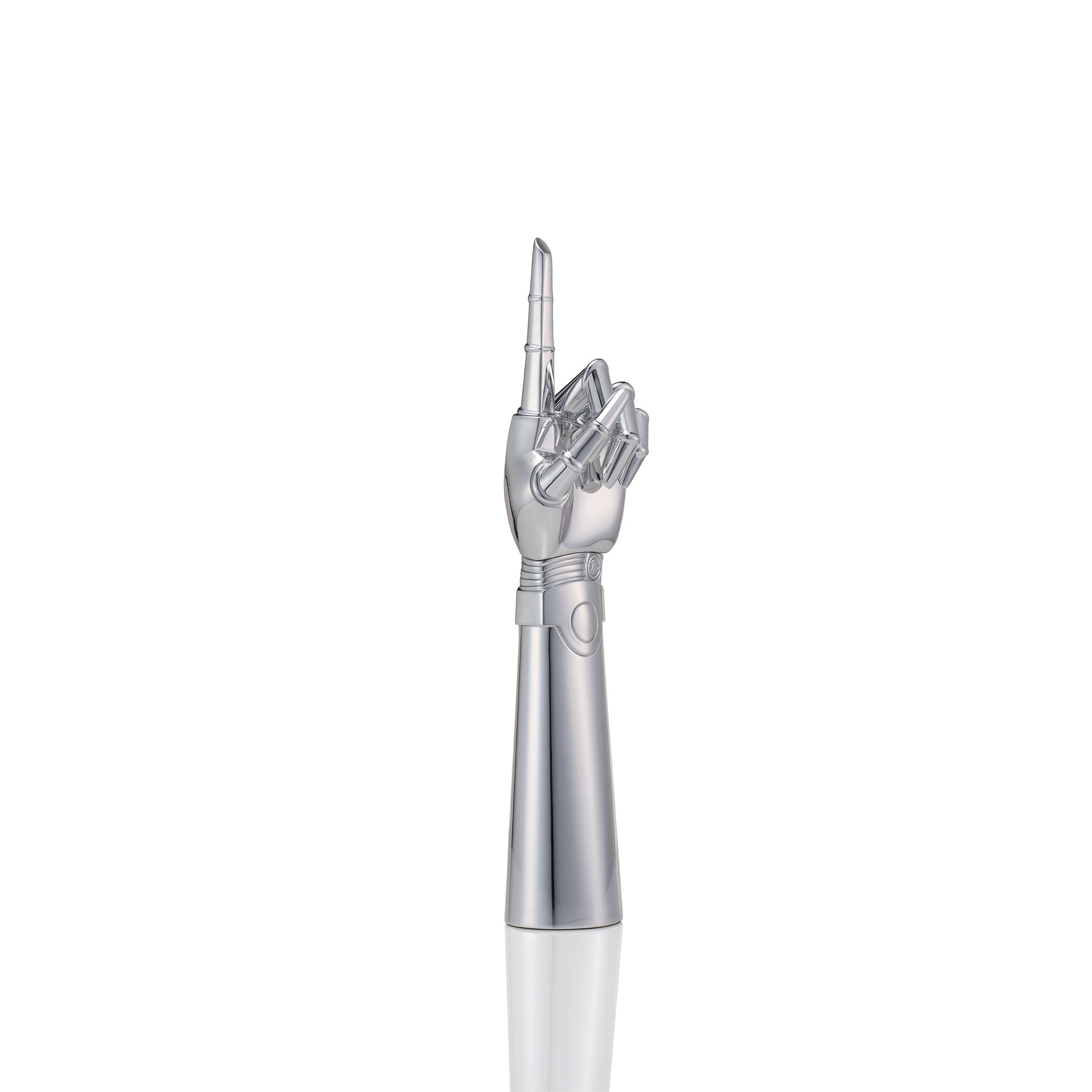 こちらに向けて差し伸べられた人差し指は、なめらかな彫刻の表面で光を反射し、その輝きは冷たい鋼の質感と、どこか温もりを感じさせる抱擁への誘いとの鮮やかなコントラストを際立たせます。